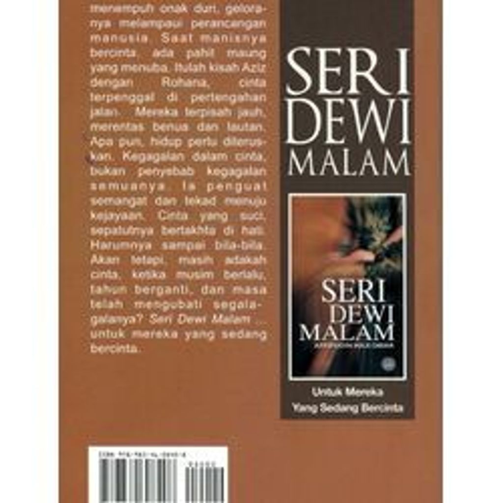 "Seri Dewi Malam", lagu yang mencantumkan dua hati. Namun, percintaan selalu menempuh onak duri, geloranya melampaui perancangan manusia. Saat manisnya bercinta, ada pahit maung yang menuba. Itulah kisah Aziz dengan Rohana, cinta terpenggal di pertengahan jalan. Mereka terpisah jauh, merentas benua dan lautan. Apa pun, hidup perlu diteruskan. Kegagalan dalam cinta, bukan penyebab kegagalan semuanya. Ia penguat semangat dan tekad menuju kejayaan. Cinta yang suci, sepatutnya bertakhta di hati. Harumnya sampai bila-bila. Akan tetapi, masih adakah cinta, ketika musim berlalu, tahun berganti, dan masa telah mengubati segala-galanya? Seri Dewi Malam ... untuk mereka yang sedang bercinta.