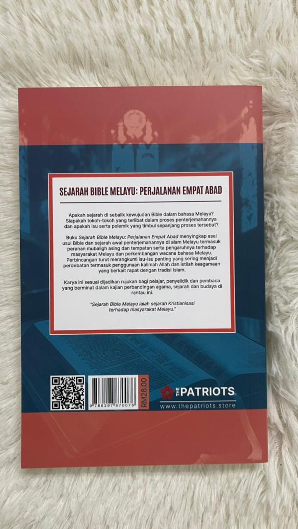 Apakah sejarah di sebalik kewujudan Bible dalam bahasa Melayu? Siapakah tokoh-tokoh yang terlibat dalam proses penterjemahannya dan apakah isu serta polemik yang timbul sepanjang proses tersebut? Buku Sejarah Bible Melayu: Perjalanan Empat Abad menyingkap asal usul Bible dan sejarah awal penterjemahannya di alam Melayu termasuk peranan mubaligh asing dan tempatan serta pengaruhnya terhadap masyarakat Melayu dan perkembangan wacana bahasa Melayu.